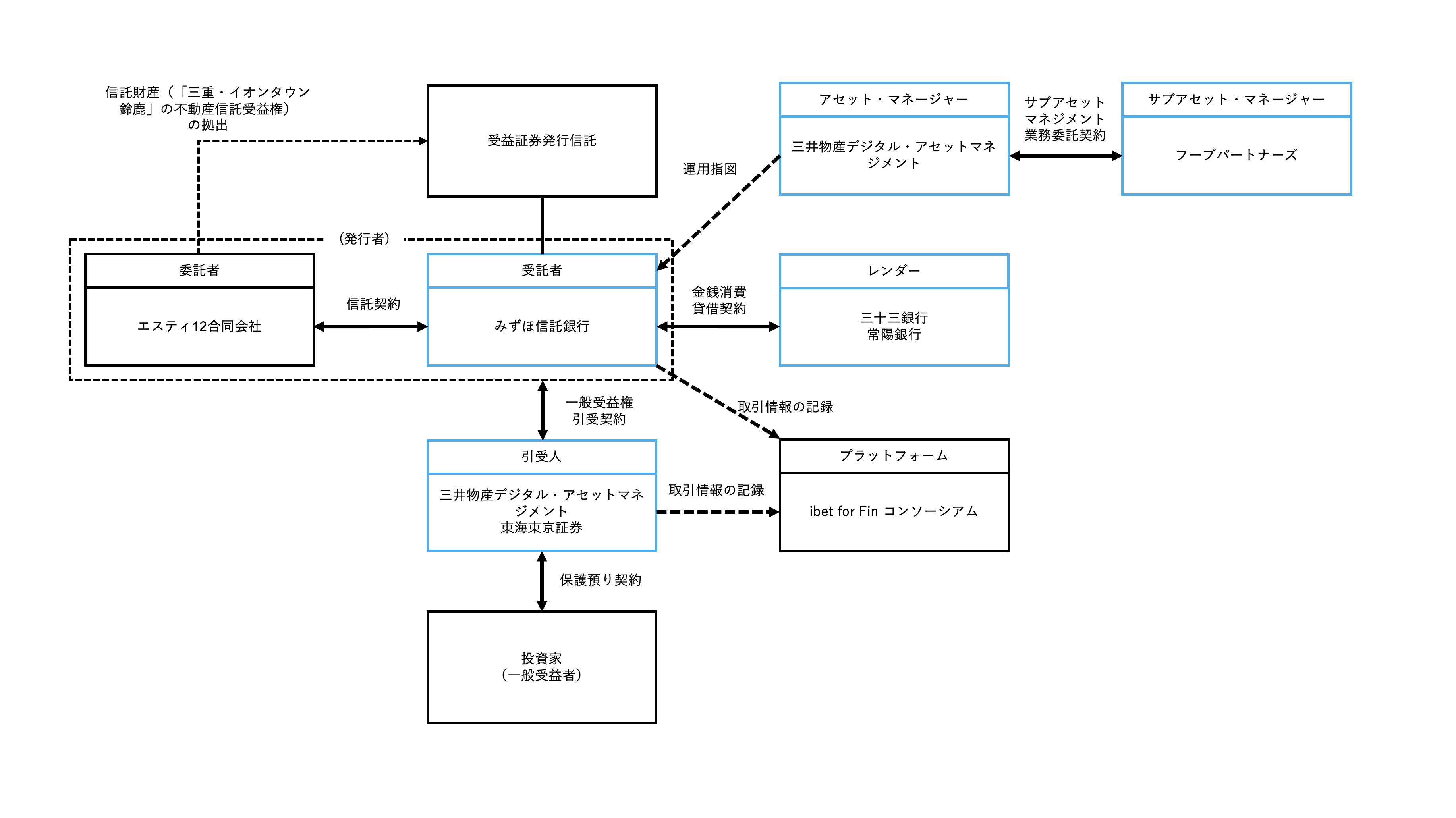本STは、三重県「鈴鹿市」に立地する商業施設のイオンタウン鈴鹿(以下「対象物件」)を裏付資産とする不動産信託受益権を信託財産として受益証券発行信託を組成し、その受益権(以下「本受益権」)に係る証券情報・取引情報を「ibet for Fin」を用いて管理する不動産セキュリティ・トークンとなります。セキュリティ・トークンの公募での発行額は47.084億円であり、本STでは、デジタル技術を活用し、一般投資家に対して単一の不動産(商業施設)への小口での投資機会を実現しています。