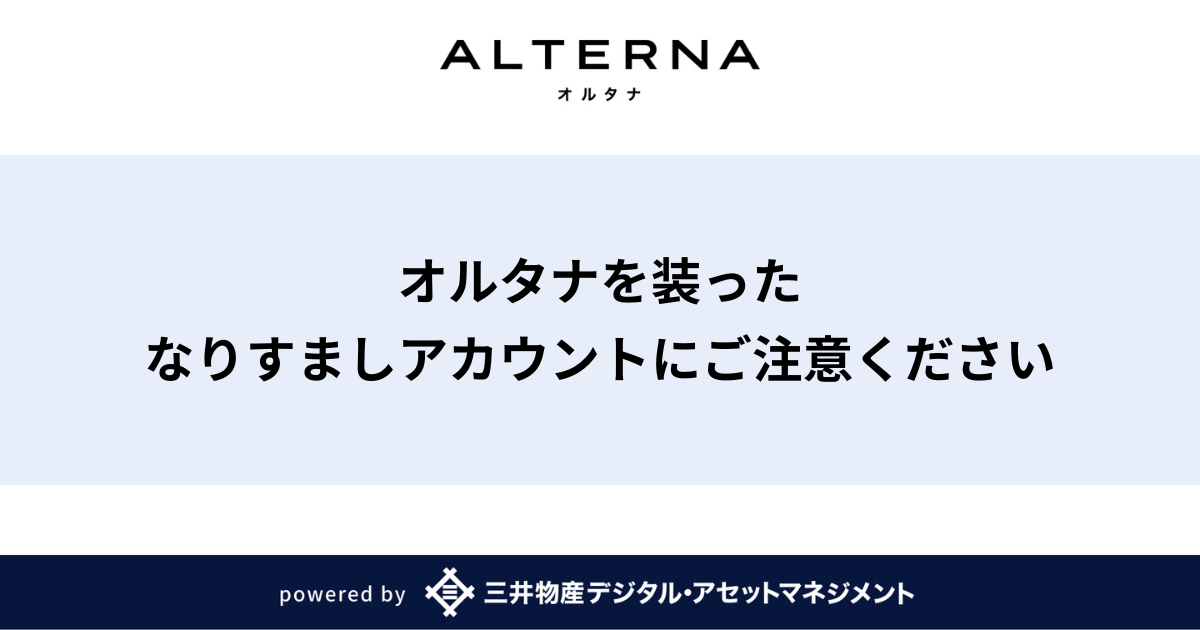 このアカウントは、オルタナのロゴや名称を無断で使用し、あたかも当社の公式アカウントであるかのように装っています。