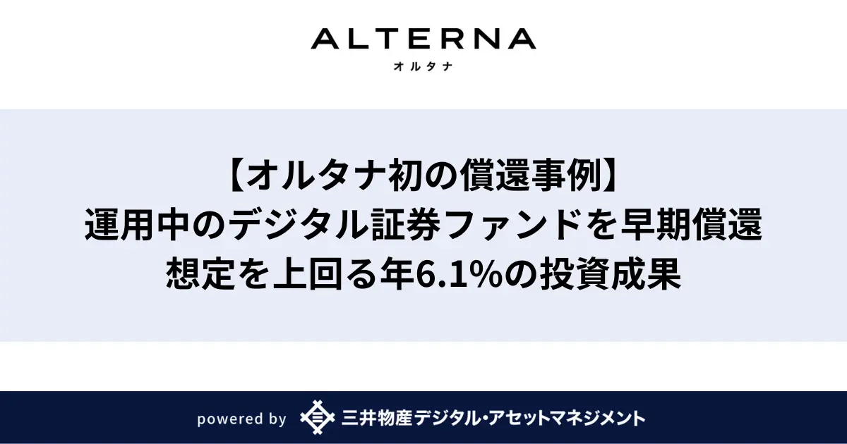 【オルタナ初の償還事例】運用中のデジタル証券ファンドを早期償還。想定を上回る年6.1%の投資成果 https://prtimes.jp/main/html/rd/p/000000087.000056997.html
